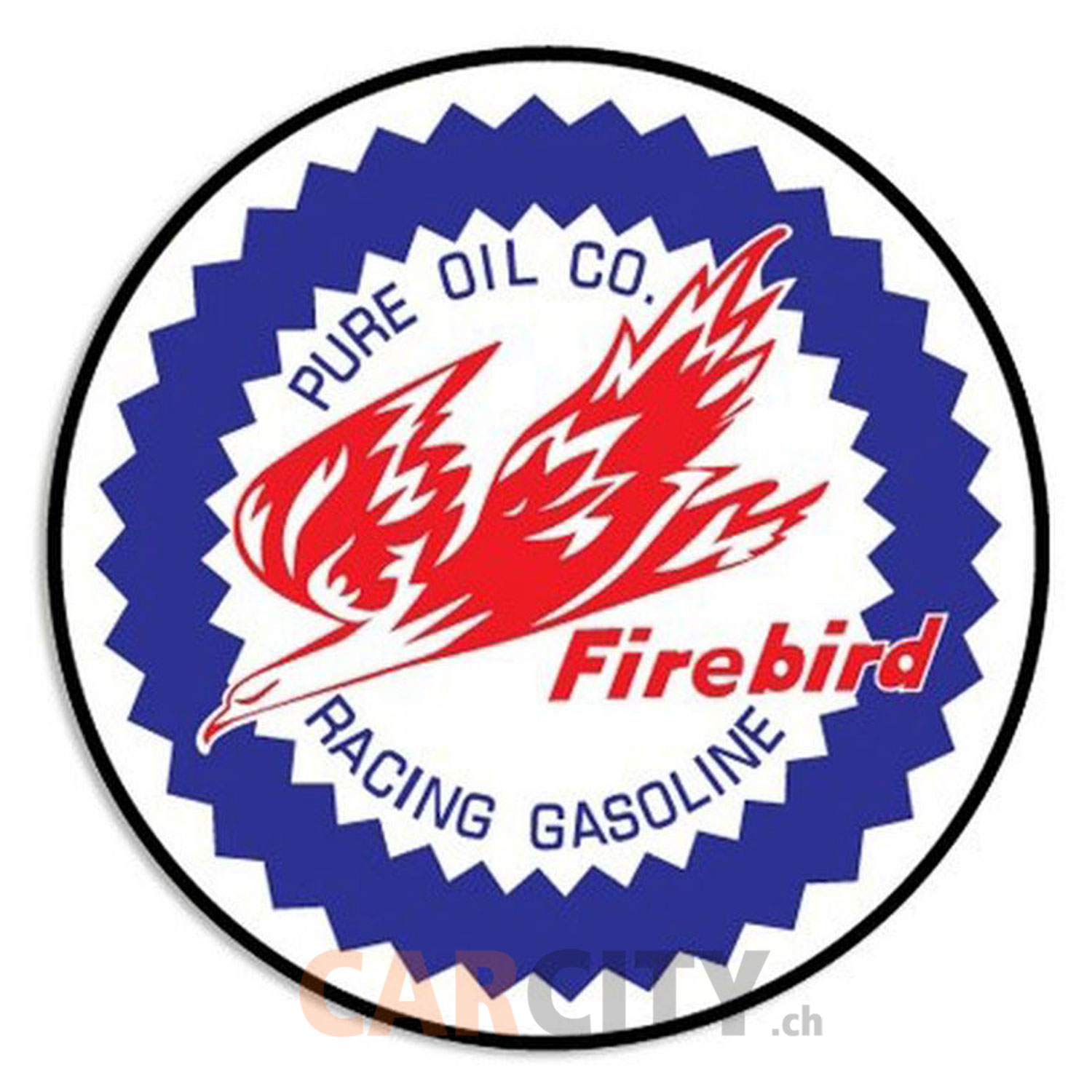Pour les amoureux du charme rétro superbe panneau en aluminium embouti de 60cm de diamètre arborant le célèbre logo Firebird Pure Oil dans un design d’époque.